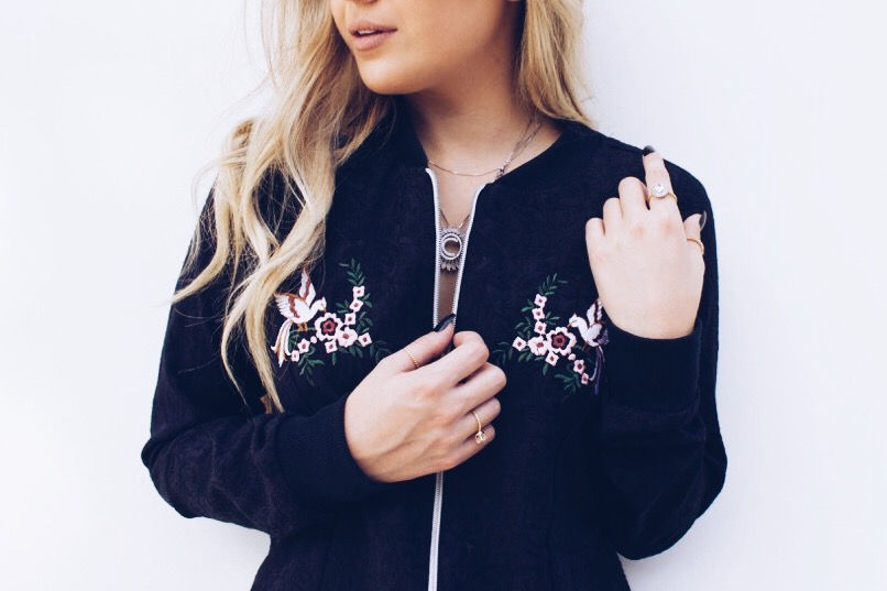 Coloquei uma bomber preta, o tecido dela é todo trabalhado e tem umas aplicações de flores bordadas, por ser preta combina com TUDO, usei como se fosse 'blusa' por dentro saia de moletom, super confortável e novamente apostei no Flatform